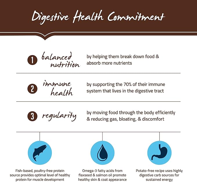 • DIGESTIVE HEALTH: Optimal levels of protein plus prebiotics and probiotics, digestive enzymes, and dietary fiber in this dog food enhance digestion for your dog