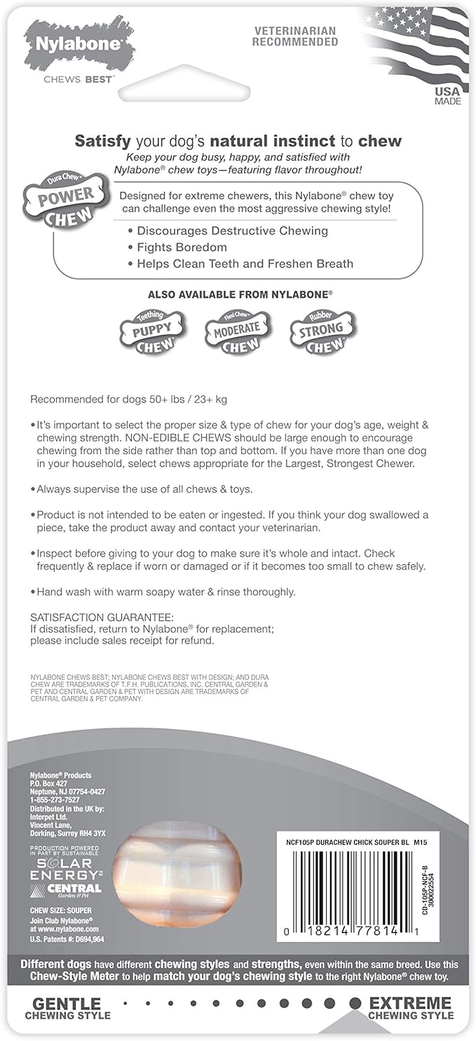 Nylabone Power Chew Textured Femur Bone Chew Toy for Dog, Indestructible Dog Toys for Aggressive Chewers Large Breed, Chicken Flavor, X-Large/Souper (1 Count)