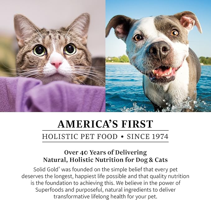 • America's First Holistic Pet Food - Solid Gold has been delivering transformative nutrition for your pet since 1974, crafting recipes with functional superfoods, omega fatty acids, high quality proteins, and protected probiotics to support gut health and overall well being