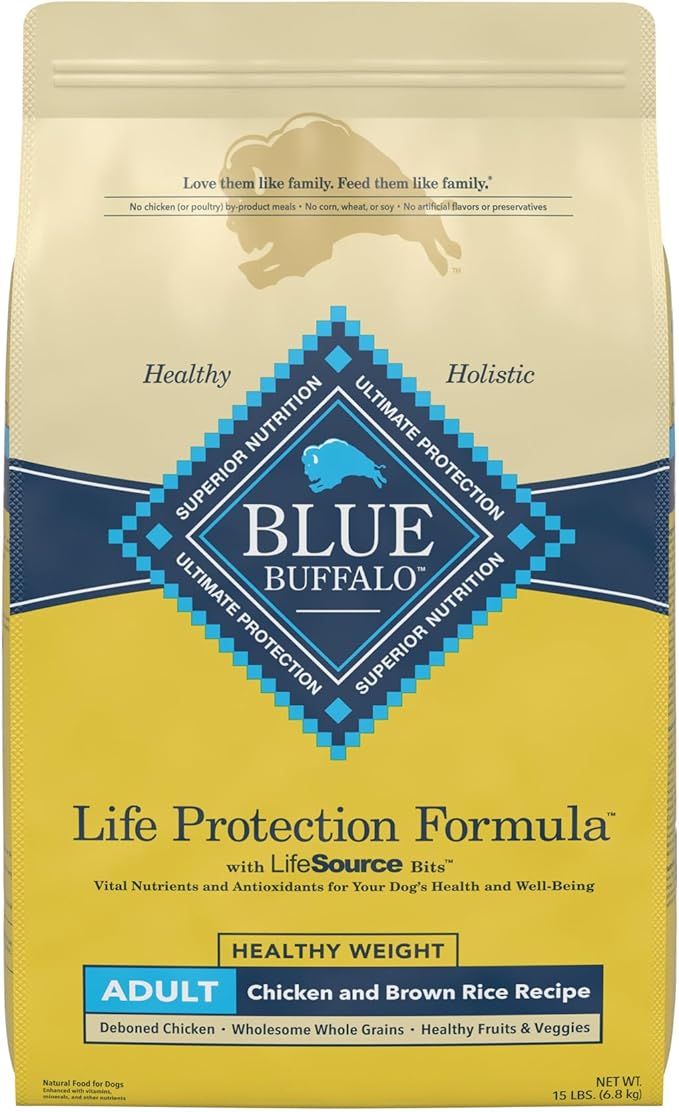 • PACKAGING MAY VARY: Contains one (1) 15 lb. Bag of BLUE Life Protection Formula Healthy Weight Adult Dry Dog Food, Chicken and Brown Rice