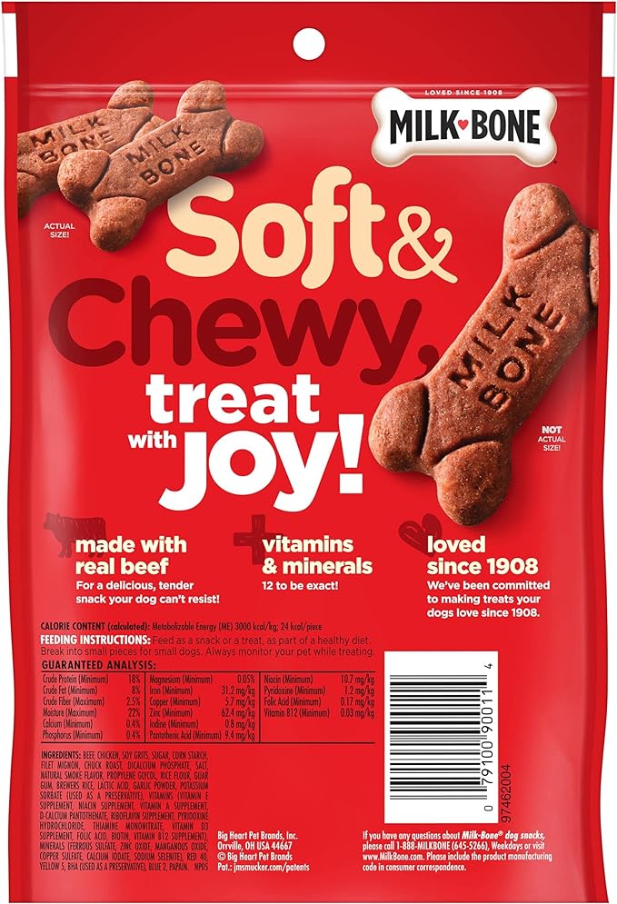 • Contains ten (10) 5.6-ounce bag of Milk-Bone Soft & Chewy Beef & Filet Mignon Recipe With Chuck Roast dog treats