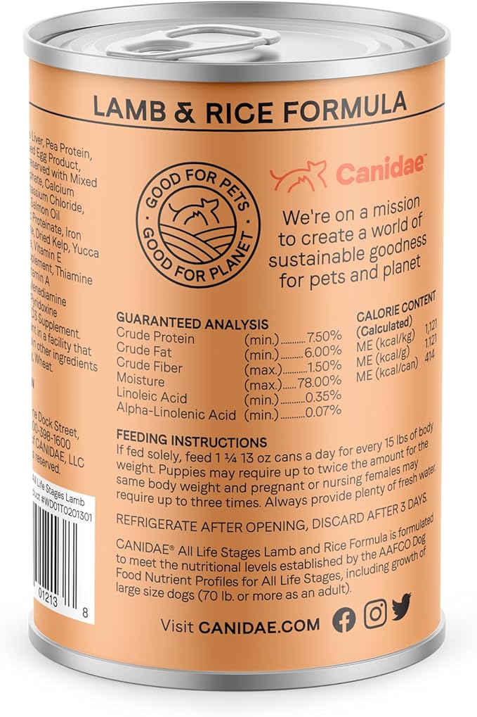 • Contains 12- 13 Ounce Cans of Canidae All Life Stages Lamb and Rice Formula Wet Dog Food