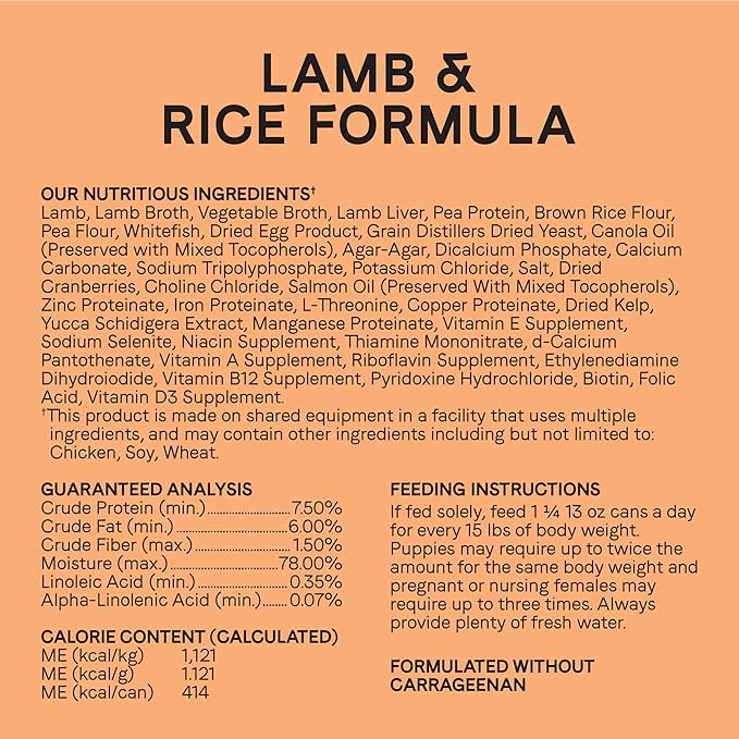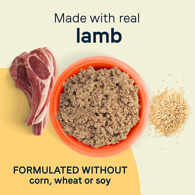 • Nutritionally dense wet food, crafted with lamb along with wholesome grains and simmered in broth for great taste, made without corn, wheat or soy