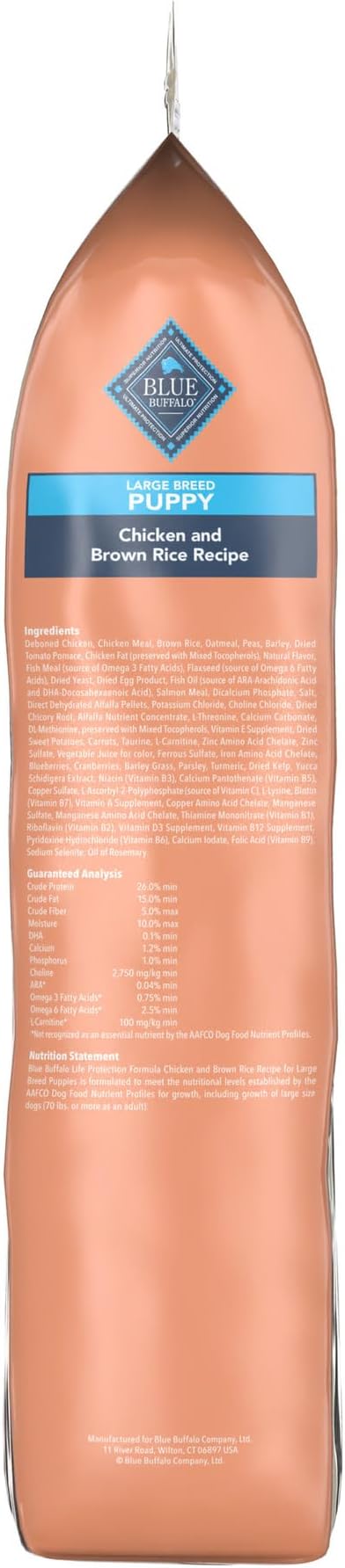 • PACKAGING MAY VARY: Contains one (1) 30 lb. Bag of BLUE Life Protection Formula Large Breed Puppy Dry Dog Food, Chicken and Brown Rice