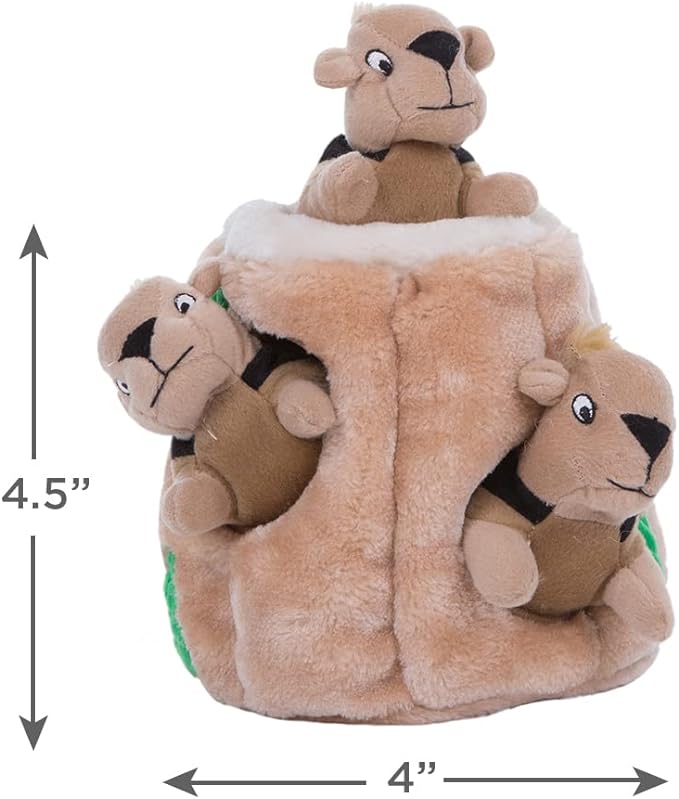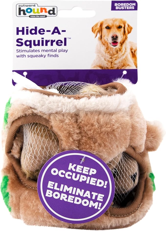 • HIDE & SQUEAK FUN: The small Hide A Squirrel dog puzzle is an easy way to get small dogs and puppies engaged for hours of fun! Just fill the tree trunk with 3 stuffed squeaky squirrels, toss it, and let your dog's natural hunting instincts kick in!