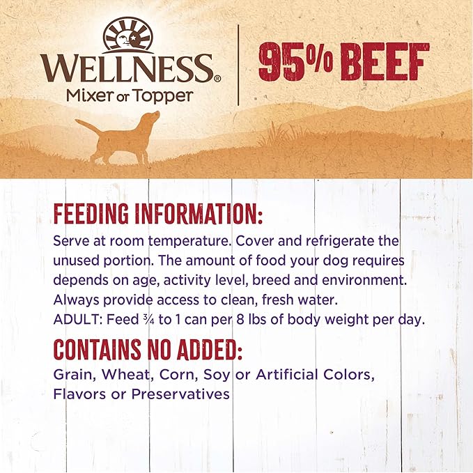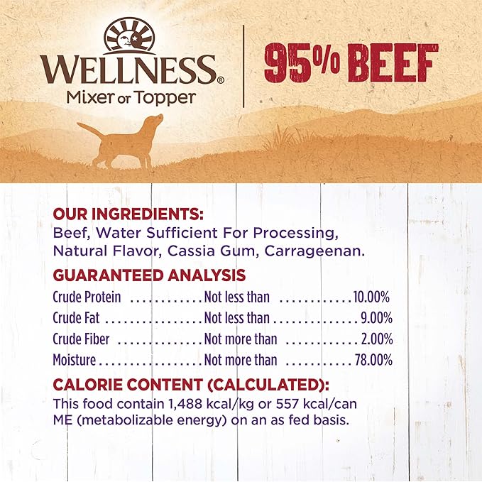 • GRAIN-FREE WET FOOD TOPPER: Each can of Wellness Ninety-Five Percent Beef Pate is packed with all-natural, grain-free beef and not much else. Serve as a delicious mixer or topper with a complete and balanced diet.