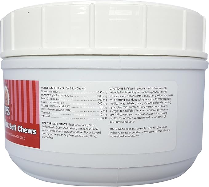 • Combines glucosamine HCI, MSM, creatine monohydrate, omega-3 fatty acids, antioxidants, vitamins and minerals in an easy to use soft chew
