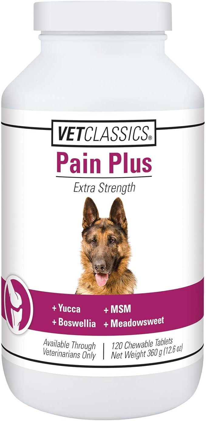 • MINIMIZE DISCOMFORT WITH PAIN PLUS DOG SUPPLEMENTS: Offer your friendly Fido respite from discomfort he needs with Vet Classics Pain Plus Extra Strength Health Supplements for dogs. Pain Plus ingredients are designed to help alleviate discomfort from daily exercise or minor aches.