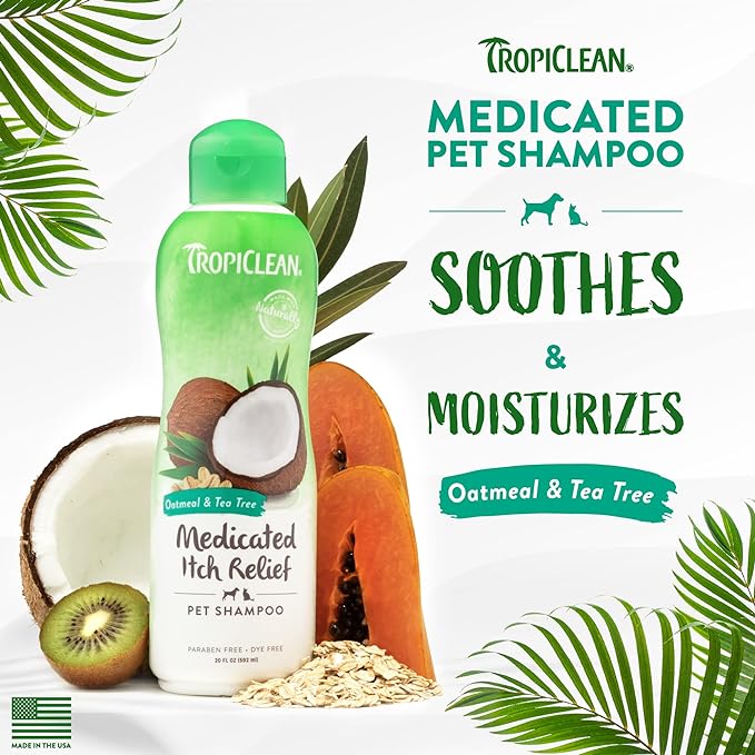 TropiClean Medicated Dog Shampoo for Allergies and Itching | Tea Tree & Oatmeal | Pet Shampoo Derived from Natural Ingredients for Sensitive Skin | Made in the USA | 20 oz.