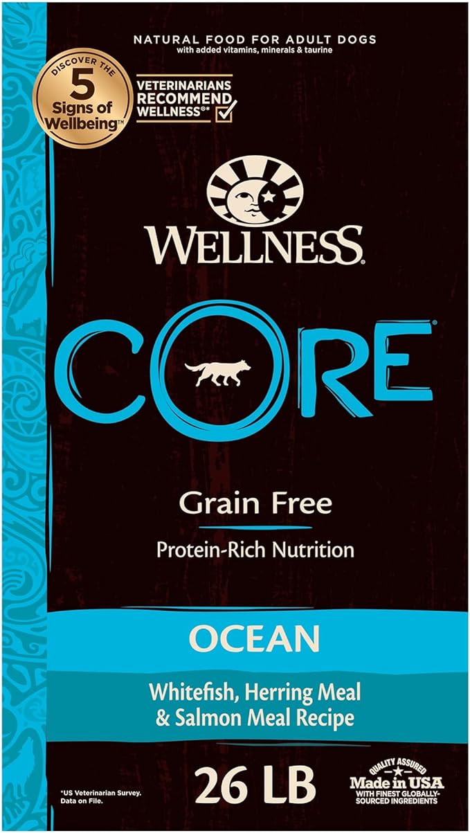 Wellness CORE Grain-Free High-Protein Dry Dog Food, Natural Ingredients, Made in USA with Real Meat, All Breeds, For Adult Dogs (Ocean Whitefish, Herring & Salmon, 26-Pound Bag)