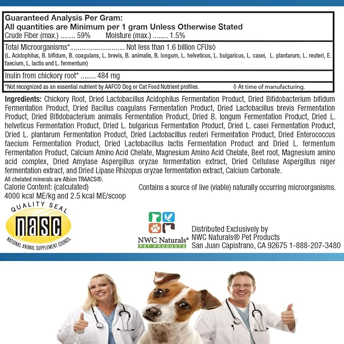 • PREMIUM INGREDIENTS MADE IN USA – NWC Naturals products are made in the USA in a GMP Certified Factory. Under strict quality and safety standards, our products are formulated just for pets with human quality ingredients. All the probiotics used are approved by AFFCO as being safe for dogs, cats, and horses. Our wonderful Total-Biotics powder contains 14 of the most researched productive live and stabilized probiotics available.