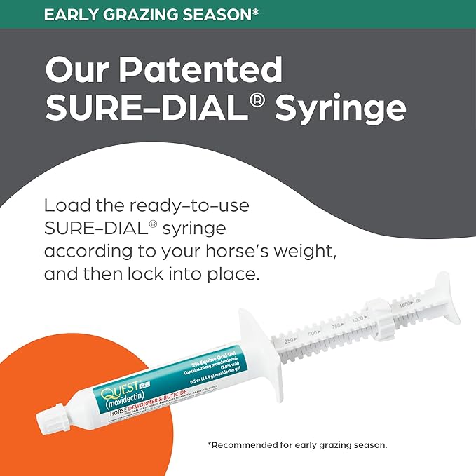• Quest Gel Horse Dewormer is packaged in a patented ready-to-use Sure-Dial syringe that is calibrated in 50 lb increments, up to 1,500 lbs. This enables the administration of the recommended dose level of 0.18 mg moxidectin/lb (0.4 mg/kg) body weight by choosing a setting consistent with your horse's weight.
