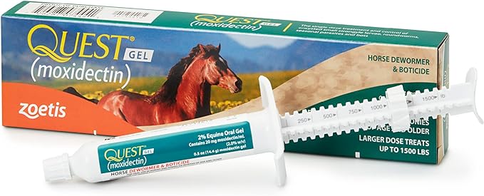 • Quest Gel is a broad-spectrum dewormer targeted to treat encysted small strongyle larvae and bots, large strongyles, roundworms, pinworms, hairworms, and stomach worms. Recommended for early grazing season use, the active ingredient moxidectin is a treatment of choice according to the American Association of Equine Practitioners.*