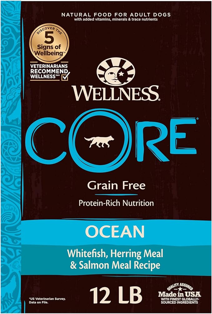 Wellness CORE Grain-Free High-Protein Dry Dog Food, Natural Ingredients, Made in USA with Real Meat, All Breeds, For Adult Dogs (Ocean Whitefish, Herring & Salmon, 12-Pound Bag)