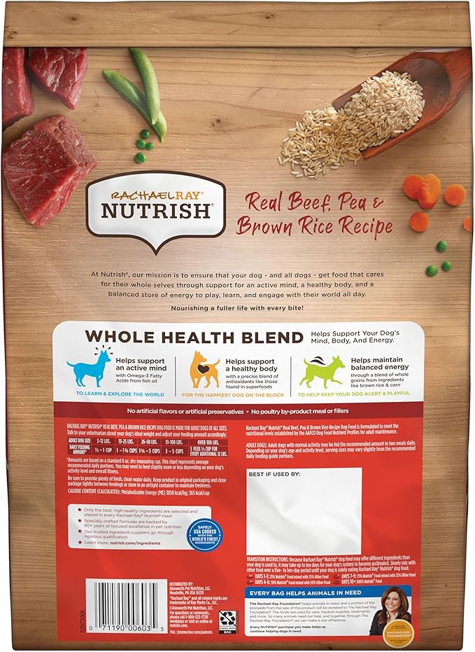 • Contains one (1) 6-pound bag of Rachael Ray Nutrish Real Beef, Pea and Brown Rice Recipe