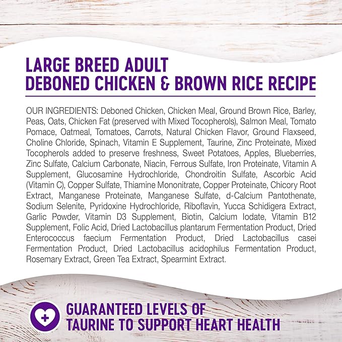 • PROTEIN RICH LARGE BREED ADULT DRY DOG FOOD: Nutritionally dense crunchy kibble with ingredients such as chicken and brown rice for whole body health.