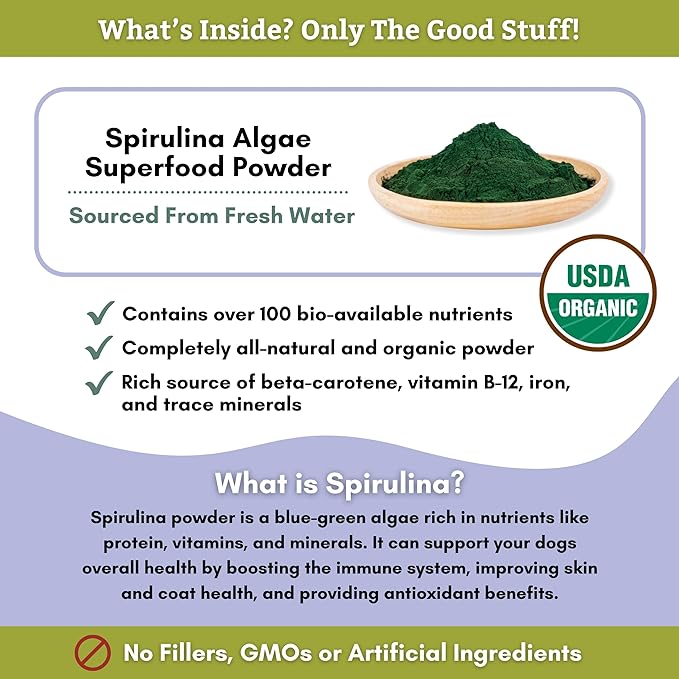 • NATURAL DOG NUTRITION: Made from raw, natural whole food ingredients, this certified organic spirulina powder for dogs is packed with healthy phytonutrients, antioxidants, amino acids, omega oils and more to give your dog the essential vitamins and nutrients they're missing in their everyday diet