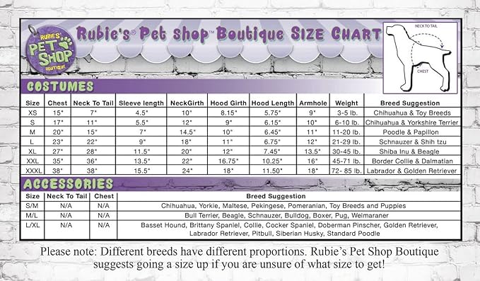 • 3. READ THE RUBIE’S PET SIZE CHART and WATCH THE SIZING INSTRUCTION VIDEO, do not select size based on breed