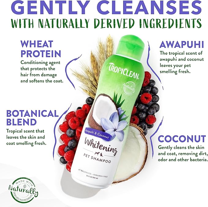 • WHITENING & BRIGHTENING – TropiClean's whitening shampoo for dogs whitens and brightens white coats, enhances all colors and removes stains.