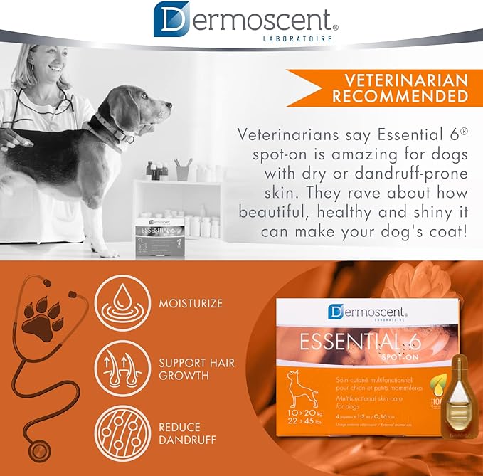 Dermoscent Essential 6 spot-on - Dog Skin Care for Dandruff & Allergy Relief with Vitamin E Oil - Anti Itch for Dogs - Natural Ingredients for Sensitive Skin - Dogs 20-40 kg - 4 Pipettes of 2.4 ml
