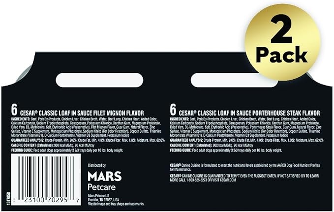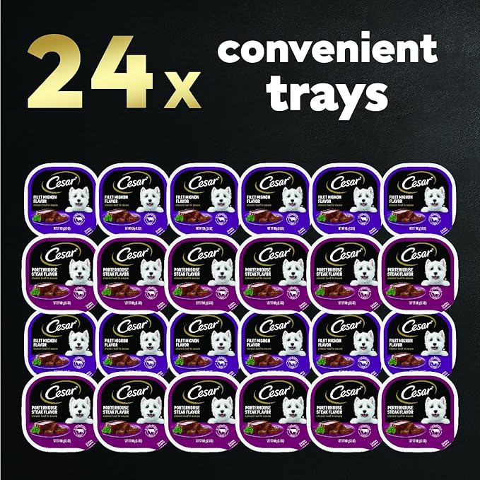 • Contains two (2) 12-count cases of 3.5 oz. easy peel trays of CESAR Wet Dog Food Classic Loaf in Sauce Filet Mignon and Porterhouse Steak Flavors Variety Pack, 24 total
