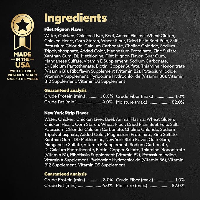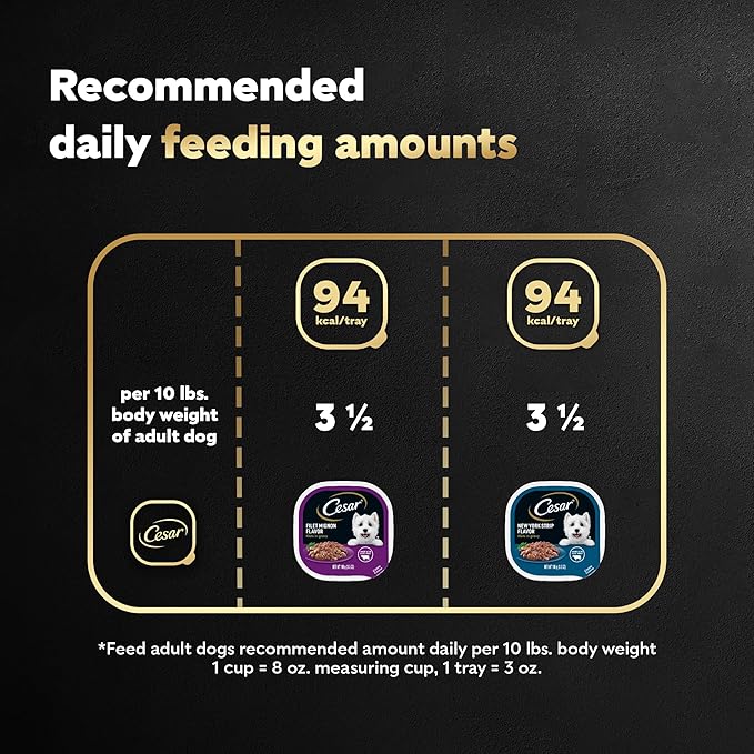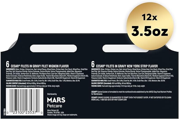 • 12-Pack: Contains six (6) 3.5 oz. packs of CESAR Filets in Gravy Filet Mignon, and six (6) 3.5 oz. packs of CESAR Filets in Gravy New York Strip Flavors , 12-Variety Pack of 3.5 oz