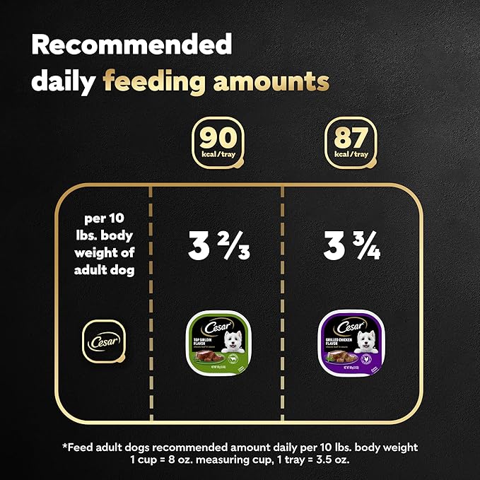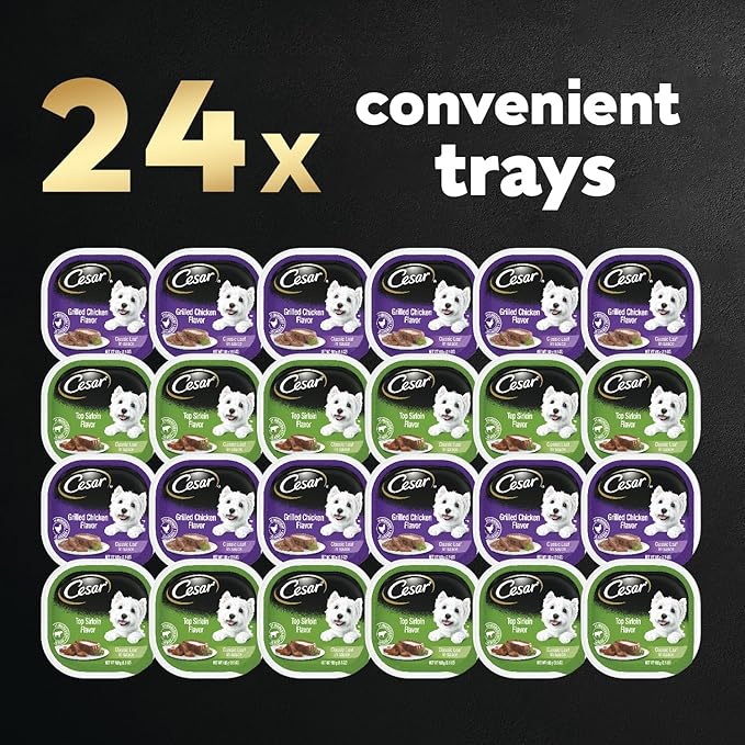 • Pack of 24: Contains two (2) 12 count cases of 3.5 oz. trays of CESAR Wet Dog Food Classic Loaf in Sauce Top Sirloin & Grilled Chicken Flavors Variety Pack: (12) Top Sirloin Flavor and (12) Grilled Chicken Flavor