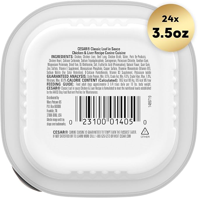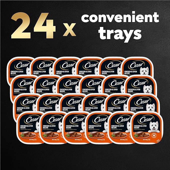 • Contains twenty-four (24) 3.5 oz. easy peel trays of CESAR Wet Dog Food Classic Loaf in Sauce Chicken and Liver Recipe
