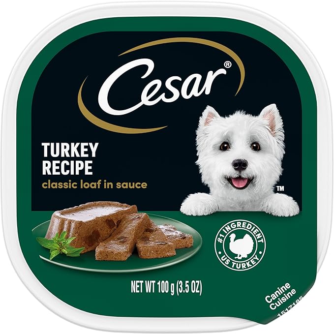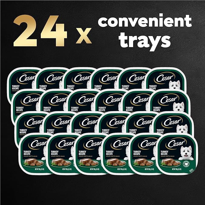 • Contains twenty-four (24) 3.5 oz. easy peel trays of CESAR Wet Dog Food Classic Loaf in Sauce Turkey Recipe, (24) 3.5 oz. Easy Peel Trays