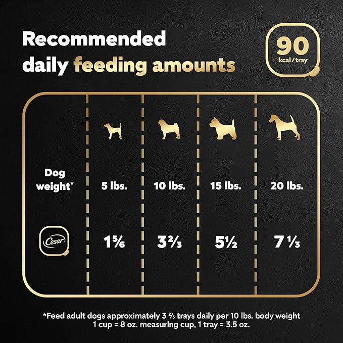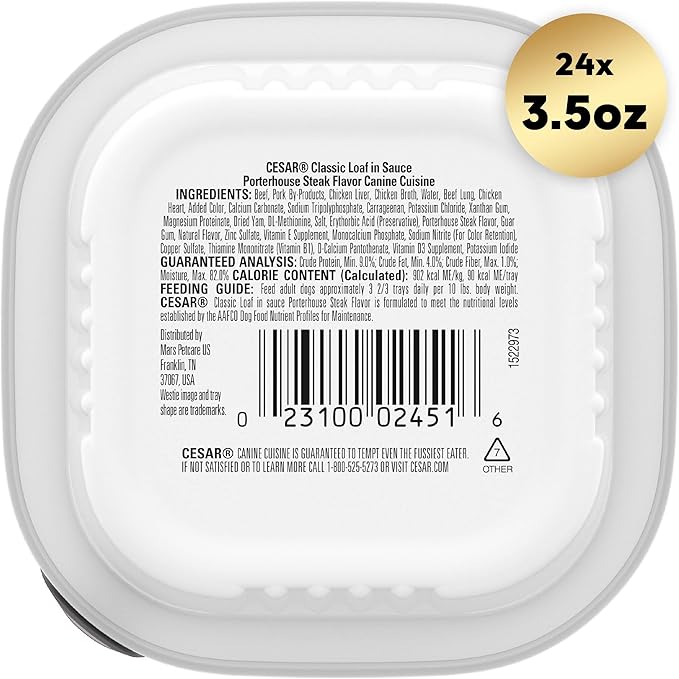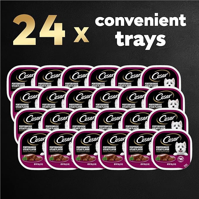 • Contains twenty-four (24) 3.5 oz. easy peel trays of CESAR Wet Dog Food Classic Loaf in Sauce Porterhouse Steak Flavor