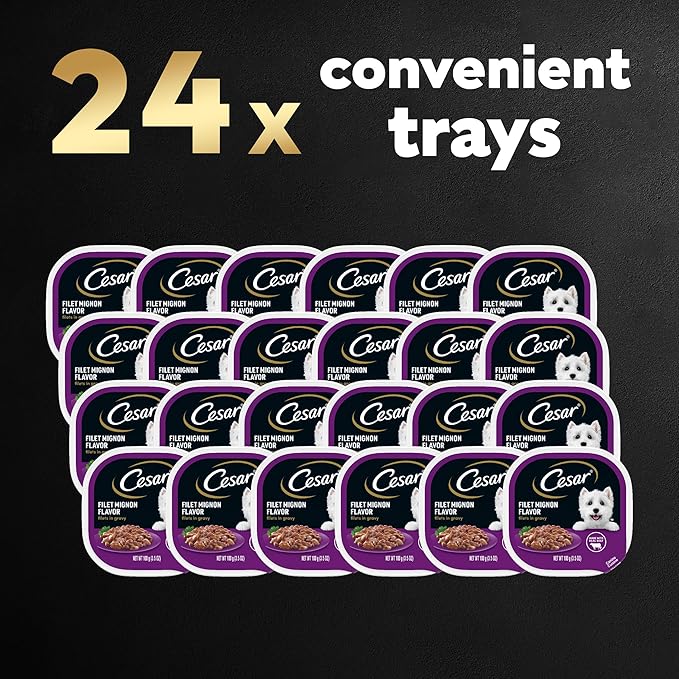 • 24-Pack: Contains twenty-four (24) 3.5 oz packs of CESAR Filets in Gravy Filet Mignon Flavor Adult Wet Dog Food