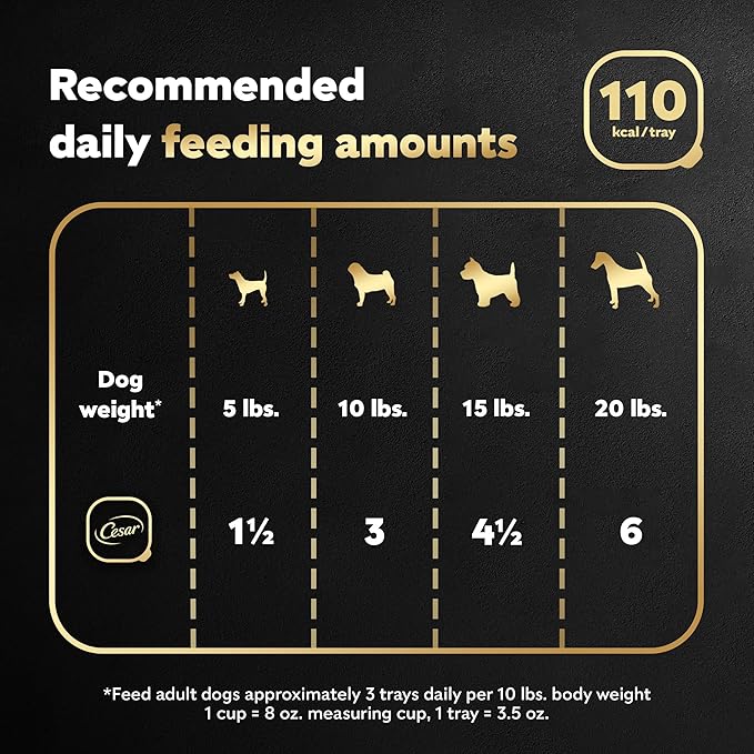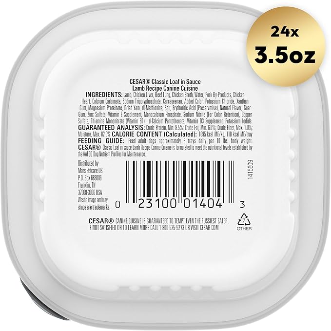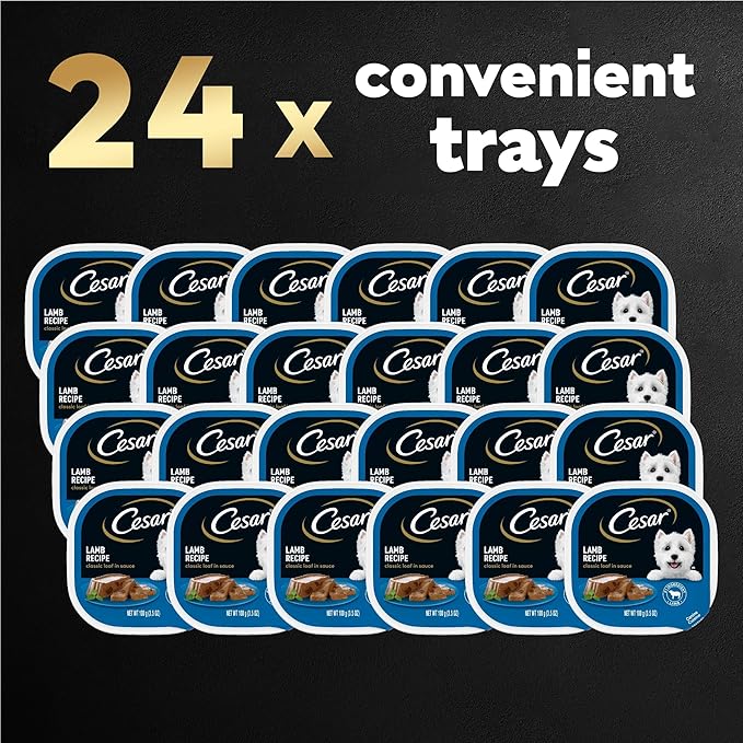 • Contains twenty-four (24) 3.5 oz. easy peel trays of CESAR Wet Dog Food Classic Loaf in Sauce Lamb Recipe
