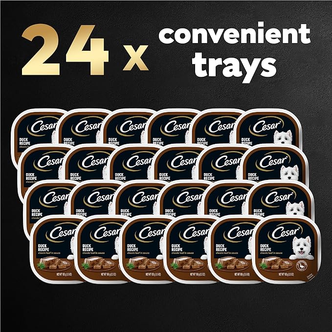 • Contains twenty-four (24) 3.5 oz. easy peel trays of CESAR Wet Dog Food Loaf in Sauce Duck Recipe