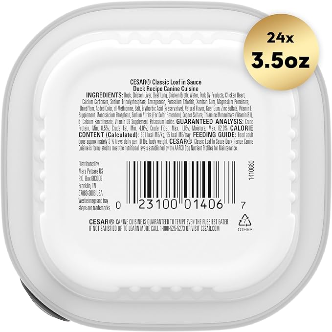 • Contains twenty-four (24) 3.5 oz. easy peel trays of CESAR Wet Dog Food Loaf in Sauce Duck Recipe