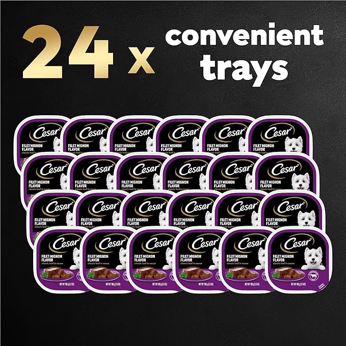 • Contains twenty-four (24) 3.5 oz. easy peel trays of CESAR Wet Dog Food Classic Loaf in Sauce Filet Mignon Flavor