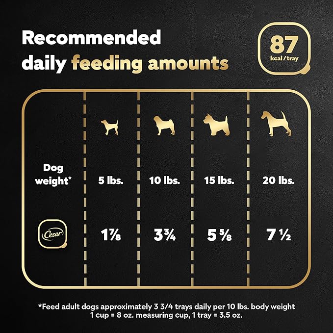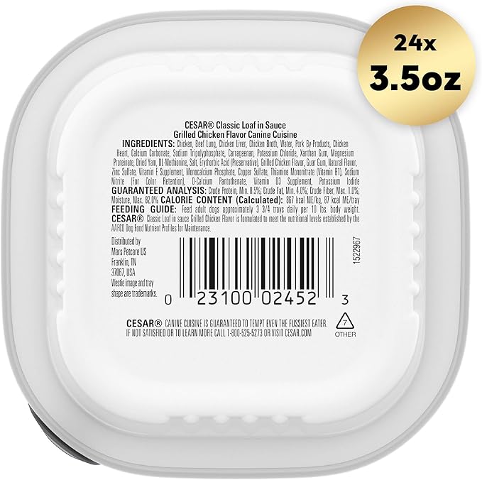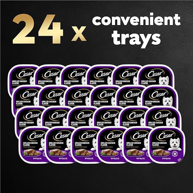 • Contains twenty-four (24) 3.5 oz. easy peel trays of CESAR Wet Dog Food Classic Loaf in Sauce Grilled Chicken Flavor