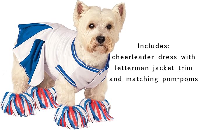 • Pet costume includes cheerleader dress in white and blue with letterman's jacket trim and matching pom-poms in white, blue and red