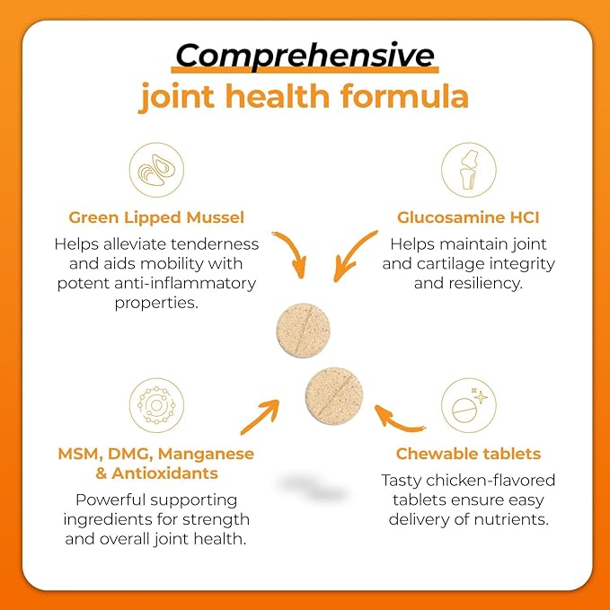 • Dog hip and joint supplement: Our dog supplement comes in delicious natural imitation roast chicken flavored chewable tablets and is recommended by veterinarians for dogs with a maximum need for joint and connective tissue support​
