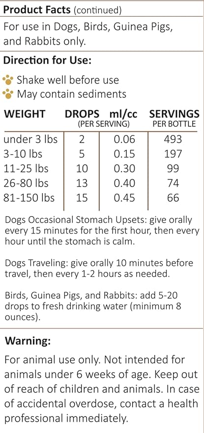 • ProTummy Stomach Comfort: The Amber NaturalZ Pro Tummy supplement for Dogs, Birds, Guinea Pigs, and Rabbits contains a proprietary blend of herbs that help with occasional stomach upsets due to food sensitivities or motion sickness during travel.