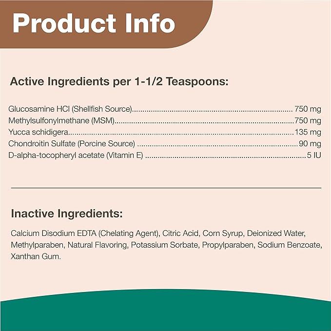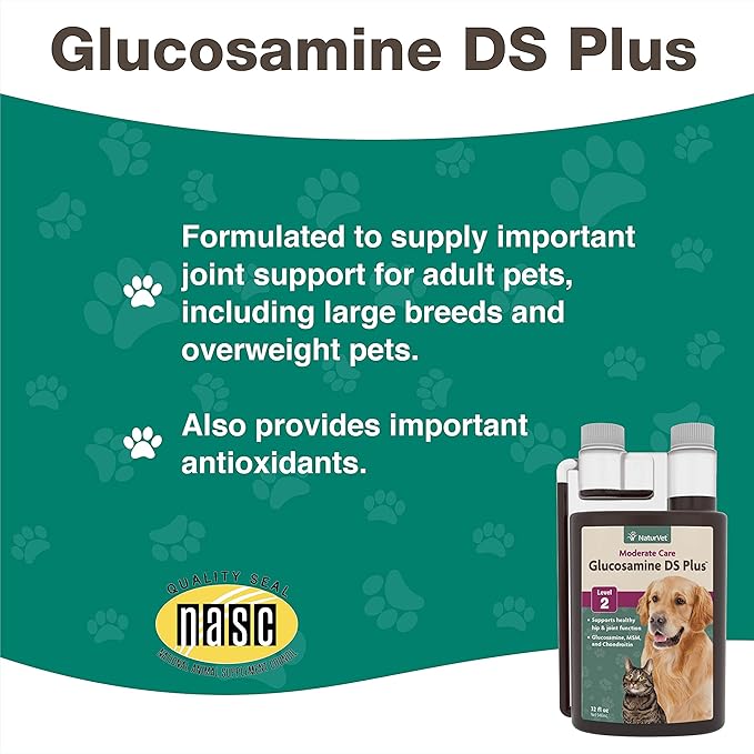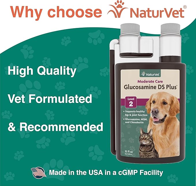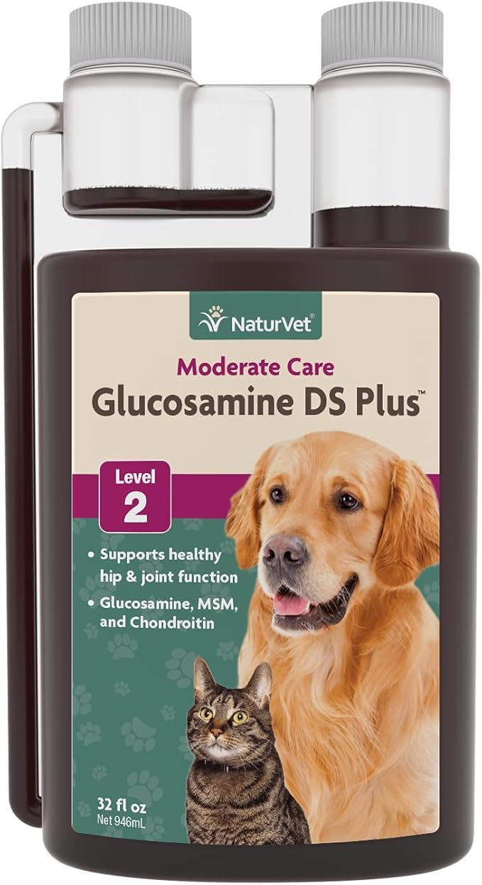 NaturVet Glucosamine DS Plus Hip & Joint Support Liquid Pet Supplement – Level 2 Moderate Care for Dogs & Cats – Includes Glucosamine, MSM, Chondroitin – 32 Oz