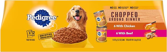 • CONTAINS A VARIETY PACK OF TWELVE (12) 13.2 OZ. CANS PEDIGREE CHOPPED GROUND DINNER Adult Canned Soft Wet Dog Food, six cans with Chicken and six cans with Beef