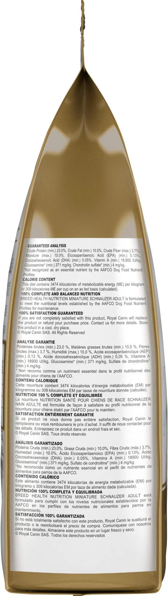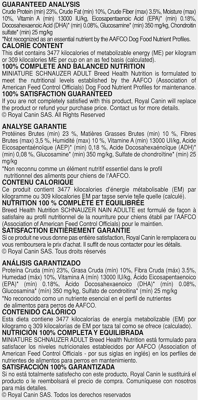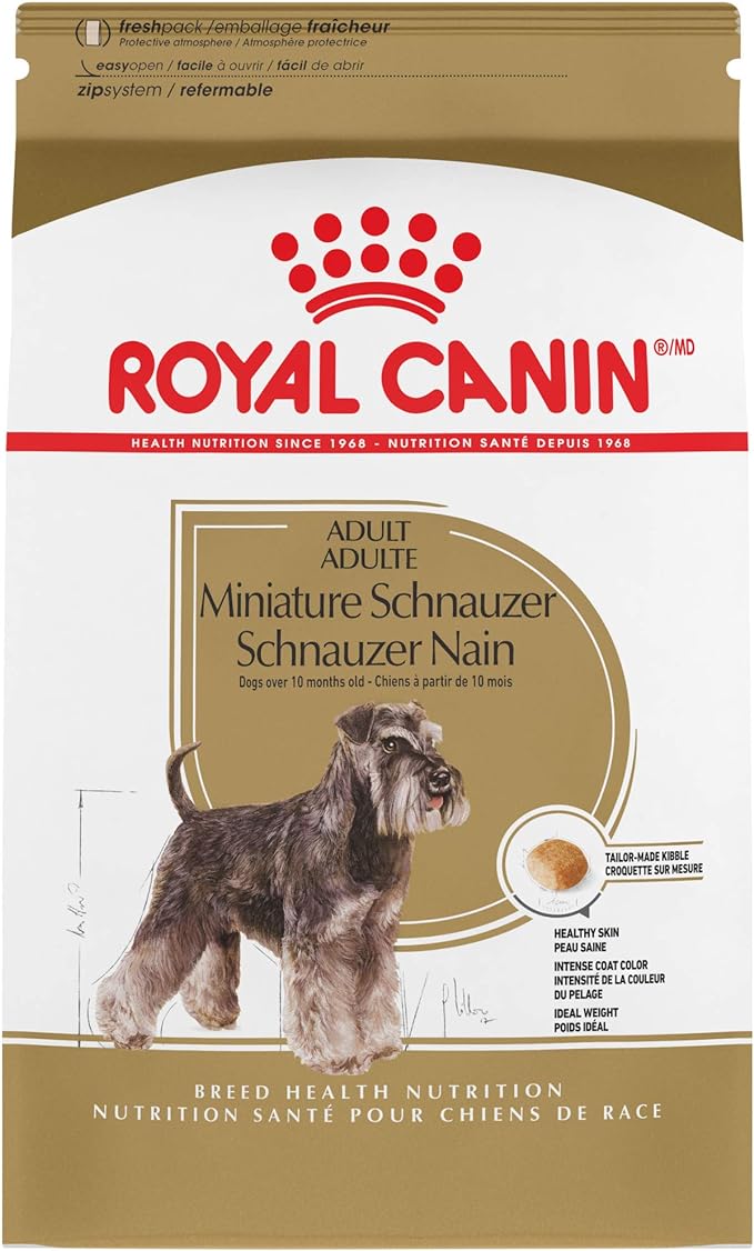• Royal Canin Miniature Schnauzer Adult dry dog food is designed to meet the nutritional needs of purebred Miniature Schnauzers 10 months and older