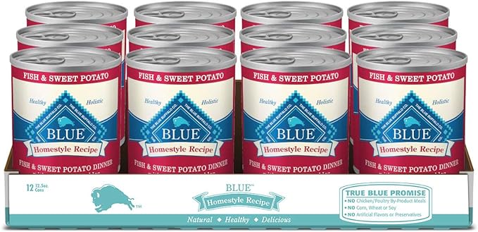 • Contains twelve (12) 12.5-oz cans of BLUE Homestyle Recipe Natural Adult Wet Dog Food, Fish & Sweet Potato