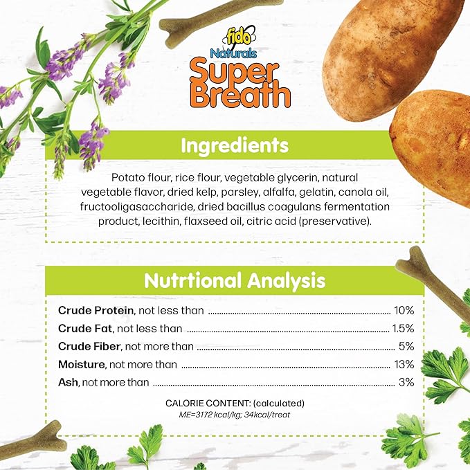 • Fido Naturals Super Breath Dog Treats (Mini) - Delicious dental care bones for extra small dogs (4 - 18 pounds). Helps reduce plaque and tartar formation. Freshens breath with daily chewing. 37 oz. bag.