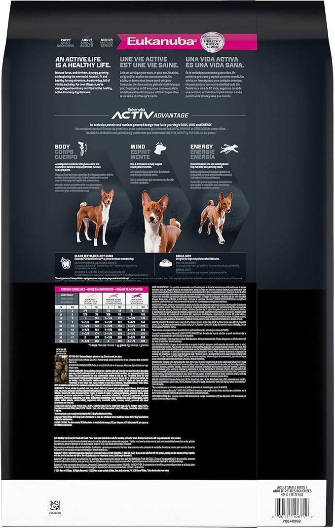 • Eukanuba Adult Small Bites dry dog food is complete and balanced nutrition for small and medium breed dogs that are 12 months or older, weighing up to 54 lbs., and have a smaller muzzle or prefer a smaller kibble