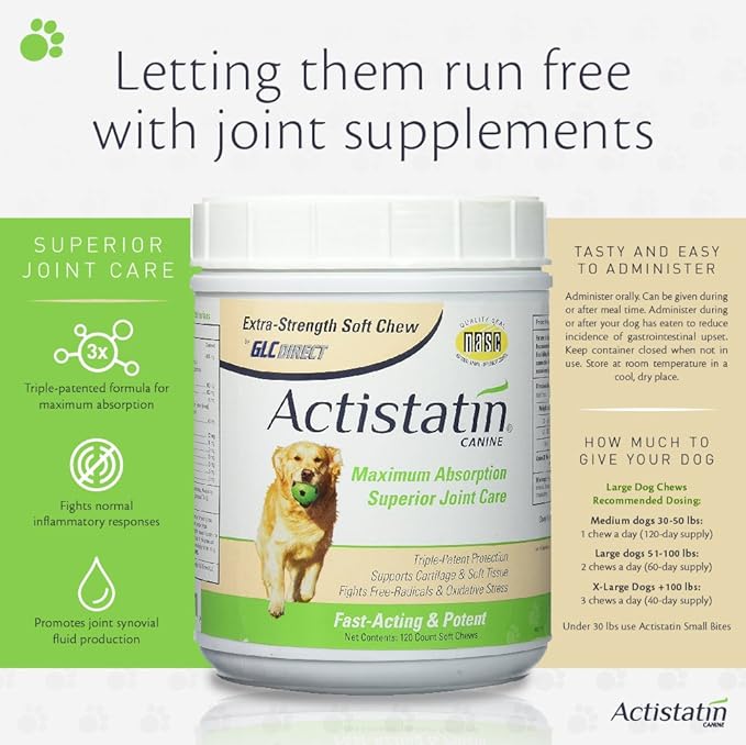 • Delicious, easy-to-give soft chews for dogs – Our Actistatin canine large dog soft chews have the highest absorption in the industry to help naturally support your dog’s healthy joints, cartilage and soft tissue. Each delicious soft chew contains an advanced, triple-patented formula that includes Glucosamine, Chondroitin, Manganese and MSM (methylsulfonylmethane) – plus antioxidants, free-radical fighters, beneficial fatty acids and more – for superior joint function and health.