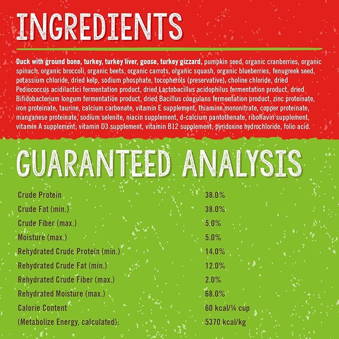 • Irresistible Taste Dogs Love! Made of 95% poultry, organs and bone, such as duck bone and turkey gizzards. Our cage-free Duck recipe will delight your pup