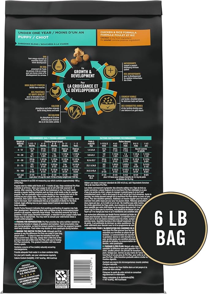 • One (1) 6 lb. Bag - Purina Pro Plan High Protein Puppy Food Shredded Blend Chicken & Rice Formula