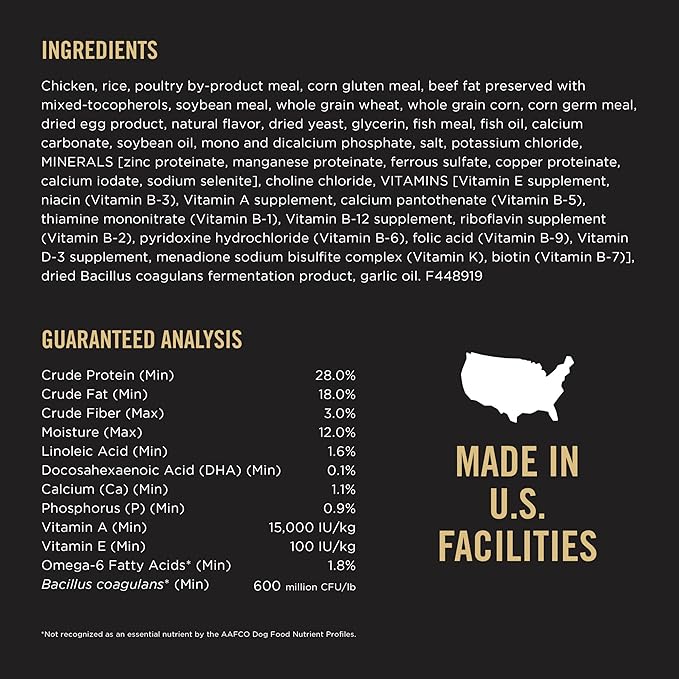 • Fortified with guaranteed live probiotics for digestive and immune health. Vitamin A and omega-6 fatty acids to nourish skin and coat