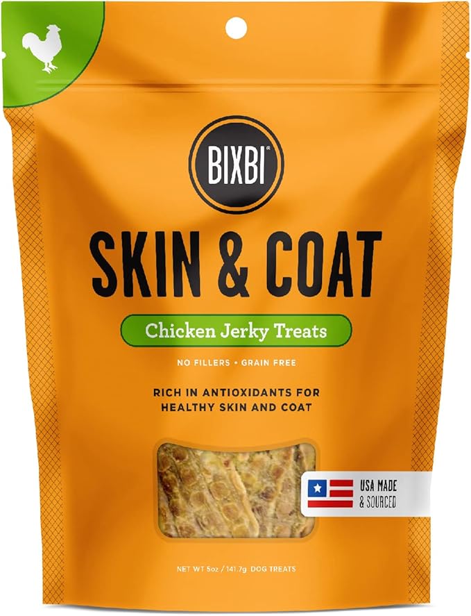 BIXBI Skin & Coat Support Chicken Jerky Dog Treats, 5 oz - USA Made Grain Free Dog Treats - Antioxidant Rich to Support Shiny, Full Bodied Coats - High in Protein, Whole Food Nutrition, No Fillers